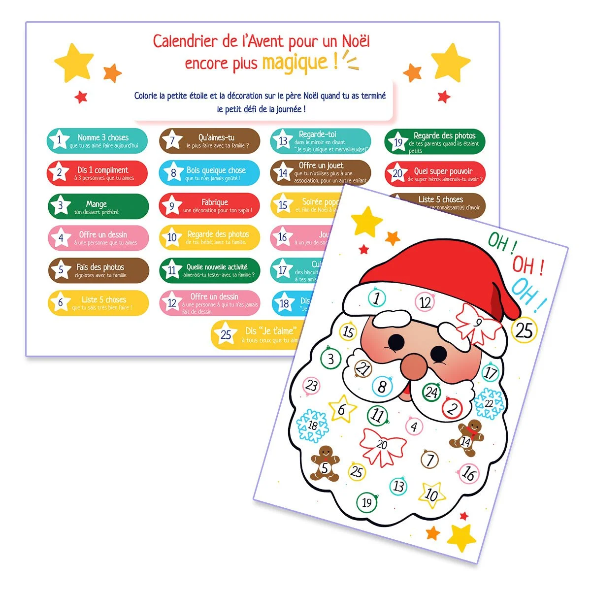 Votre enfant peut trouver le bon jour sur le Père-Noël, colorier la petite boule de Noël puis lire le petit défi associé sur la seconde page.