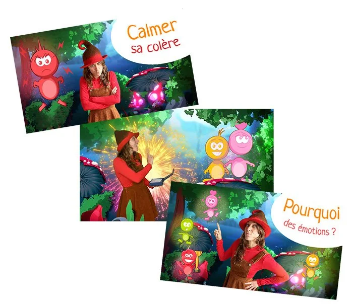 Je me transforme en Maîtresse Amayette, la maîtresse des émotions et votre enfant découvre mon univers : je l’emmène dans ma forêt fantastique, à la découverte de 14 émotions (joie, colère, étonnement, jalousie, fierté, peur, etc.), personnifiées sous forme de lutins !